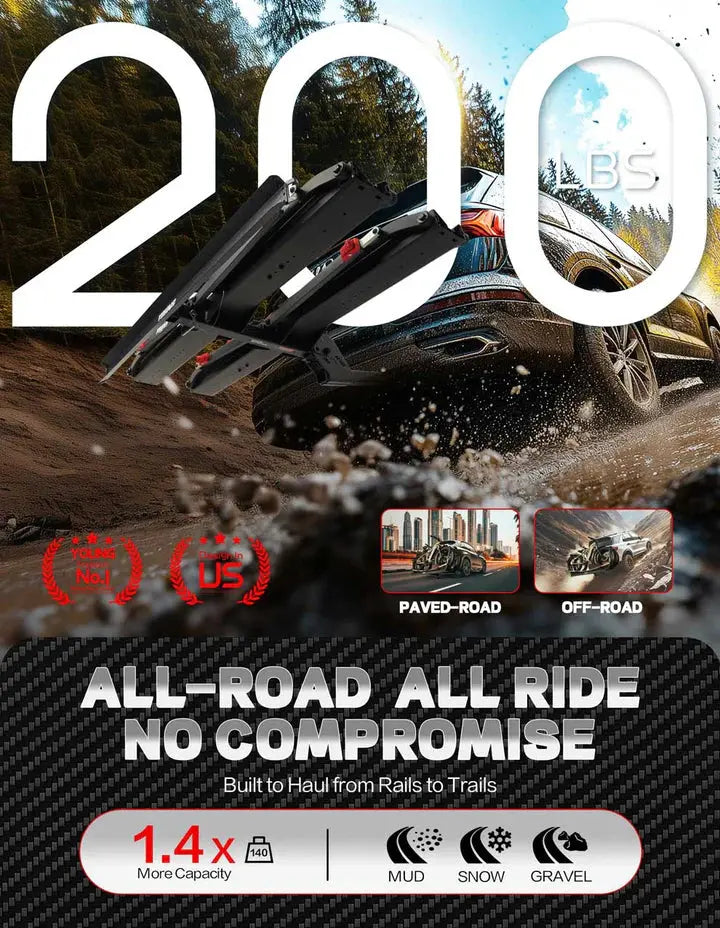 Transform your e-bike adventures with our premium e-bike rack designed specifically for heavy electric bikes. This 200lbs capacity tire-clamp system delivers unmatched stability and protection for your valuable e-bike investment, whether you're heading to rugged trails or navigating city streets.