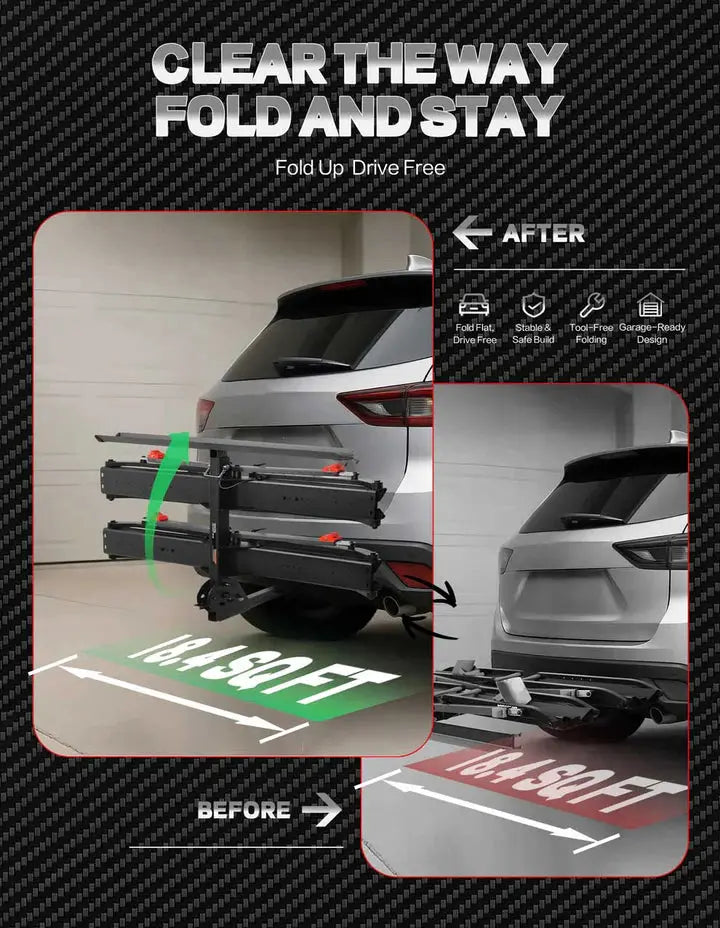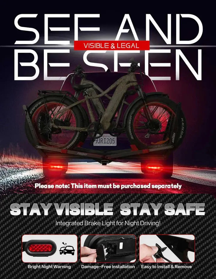Includes integrated loading ramp for easy bike mounting (supports heavy e-bikes) and 90° foldable design that clears your trunk space. Optional brake light compatibility (sold separately) enhances night visibility. Quick-install hitch system gets you road-ready in minutes, not hours.