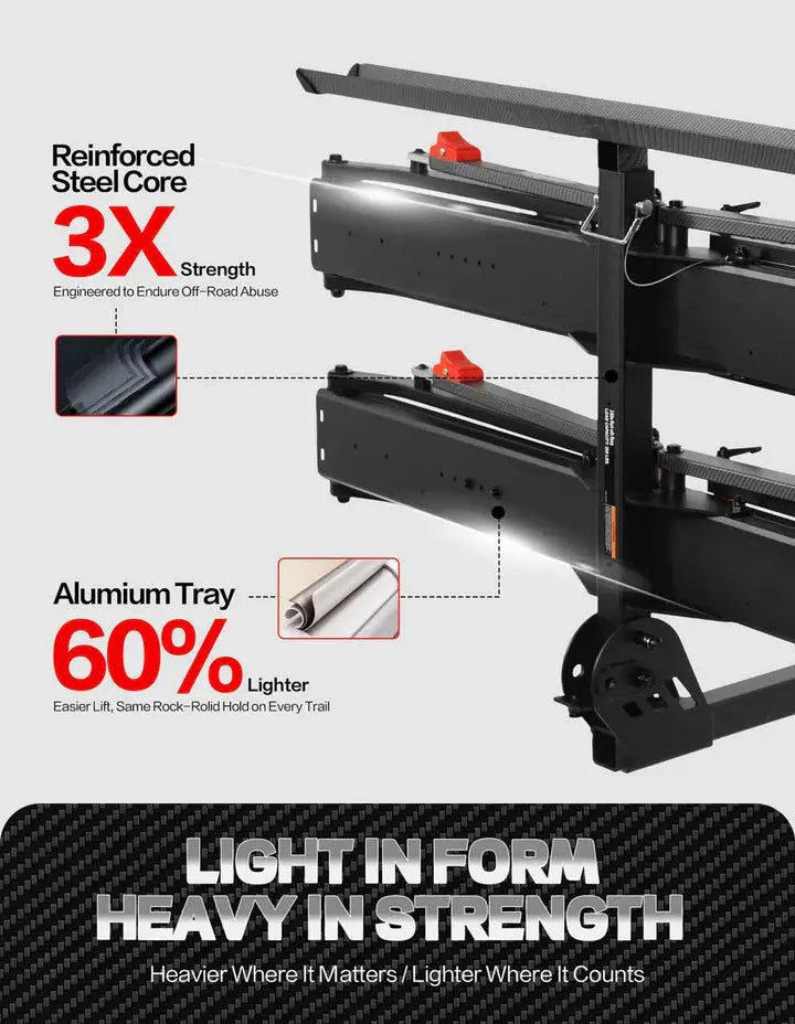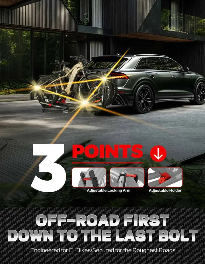Features three-point reinforced locking mechanism that outperforms standard two-point racks. The overbuilt off-road first design with advanced anti-wobble technology keeps bikes secure even on bumpy terrain - "Locked by Three. Trusted Anywhere." Your e-bike stays perfectly positioned mile after mile.