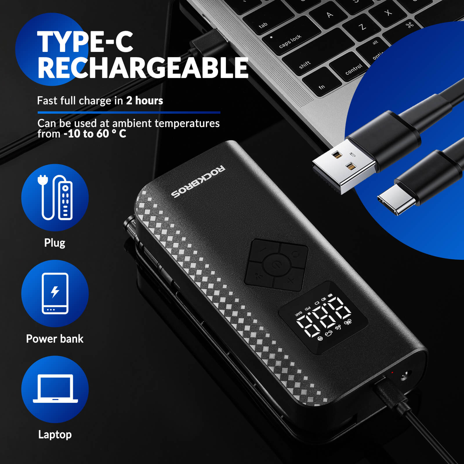 Fast Inflation & Charging: High-speed motor for rapid inflation; fully charges in just two hours with Type-C fast charging.