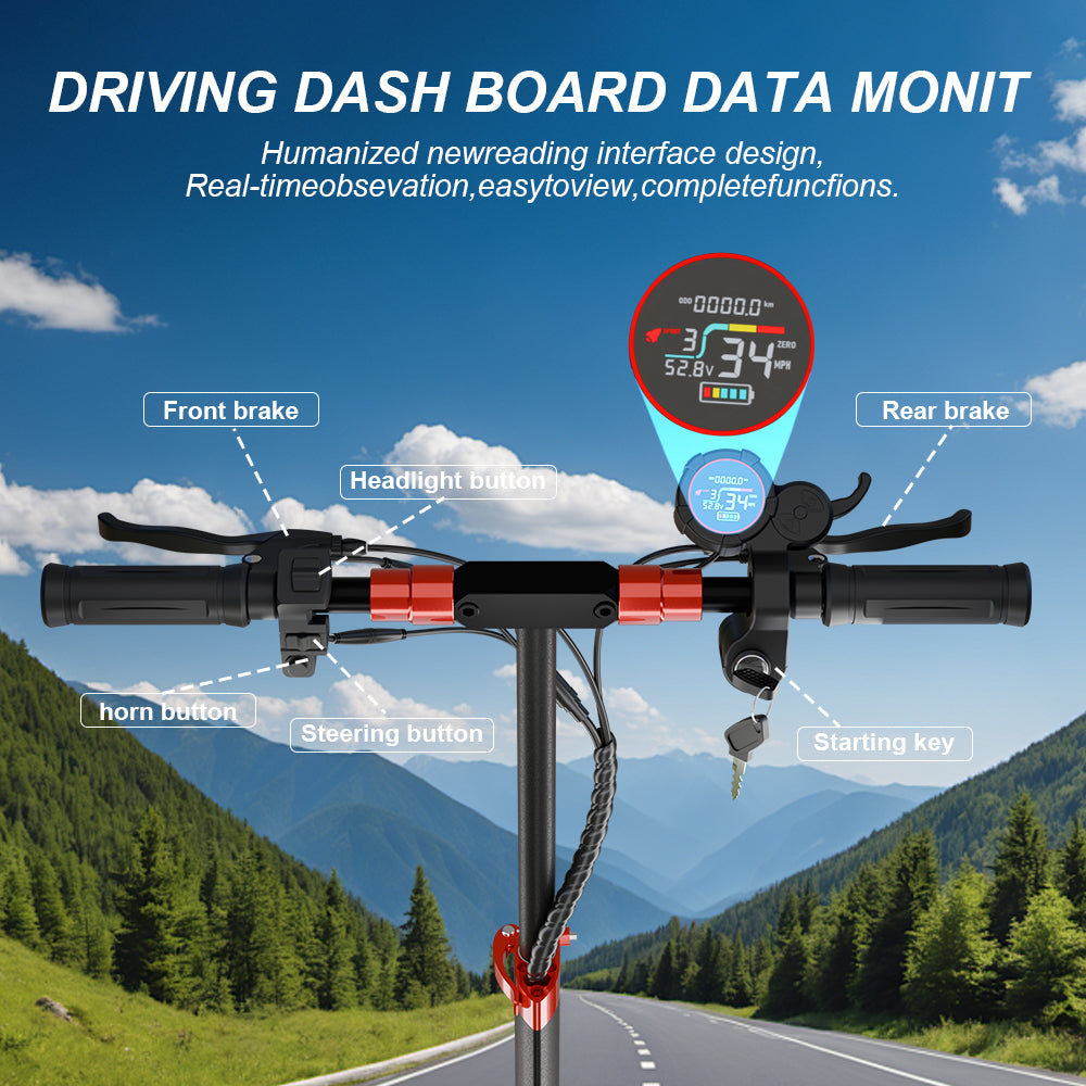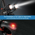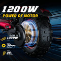 1. 1200W motor 2. Double suspension for comfort 3. 11” off-road tires 4. Front & rear LED lights for night visibility.