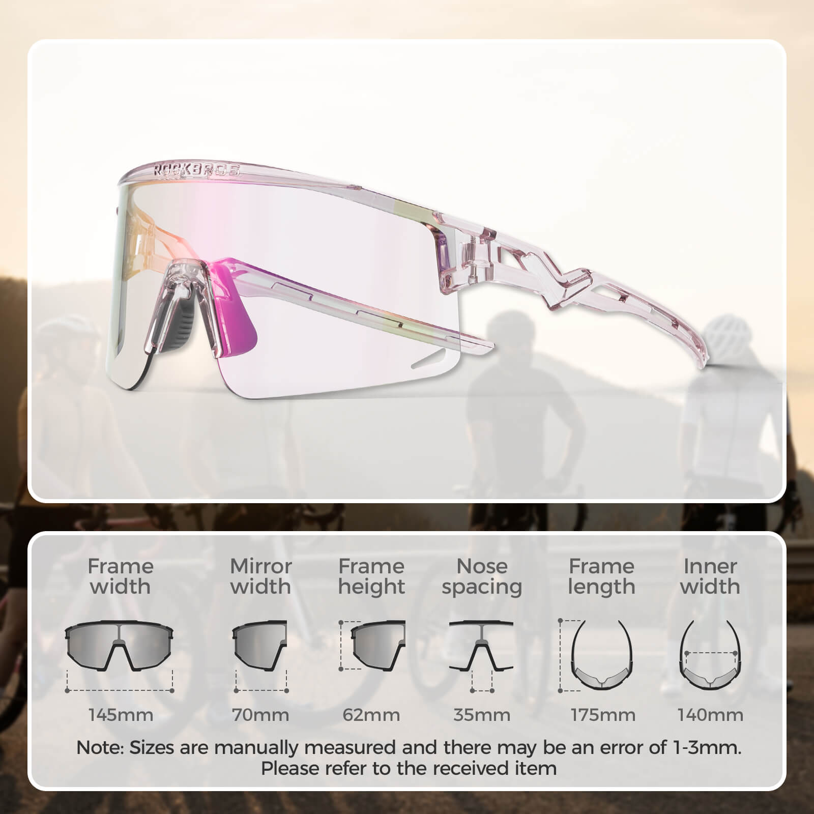 Hit the road with confidence wearing ROCKBROS Half Frame Photochromic Cycling Sunglasses. The advanced photochromic lenses adapt instantly to changing light, keeping your vision sharp from bright sunny streets to shaded trails. The half-frame design gives you an unobstructed lower view while covering your eyes above, cutting glare, and boosting contrast for safer rides. Lightweight and durable, they stay comfortable during long commutes, weekend adventures, or intense training sessions. The clear white lens version features anti-fog protection, making them perfect for all-weather cycling and every adventure your ride takes you on.