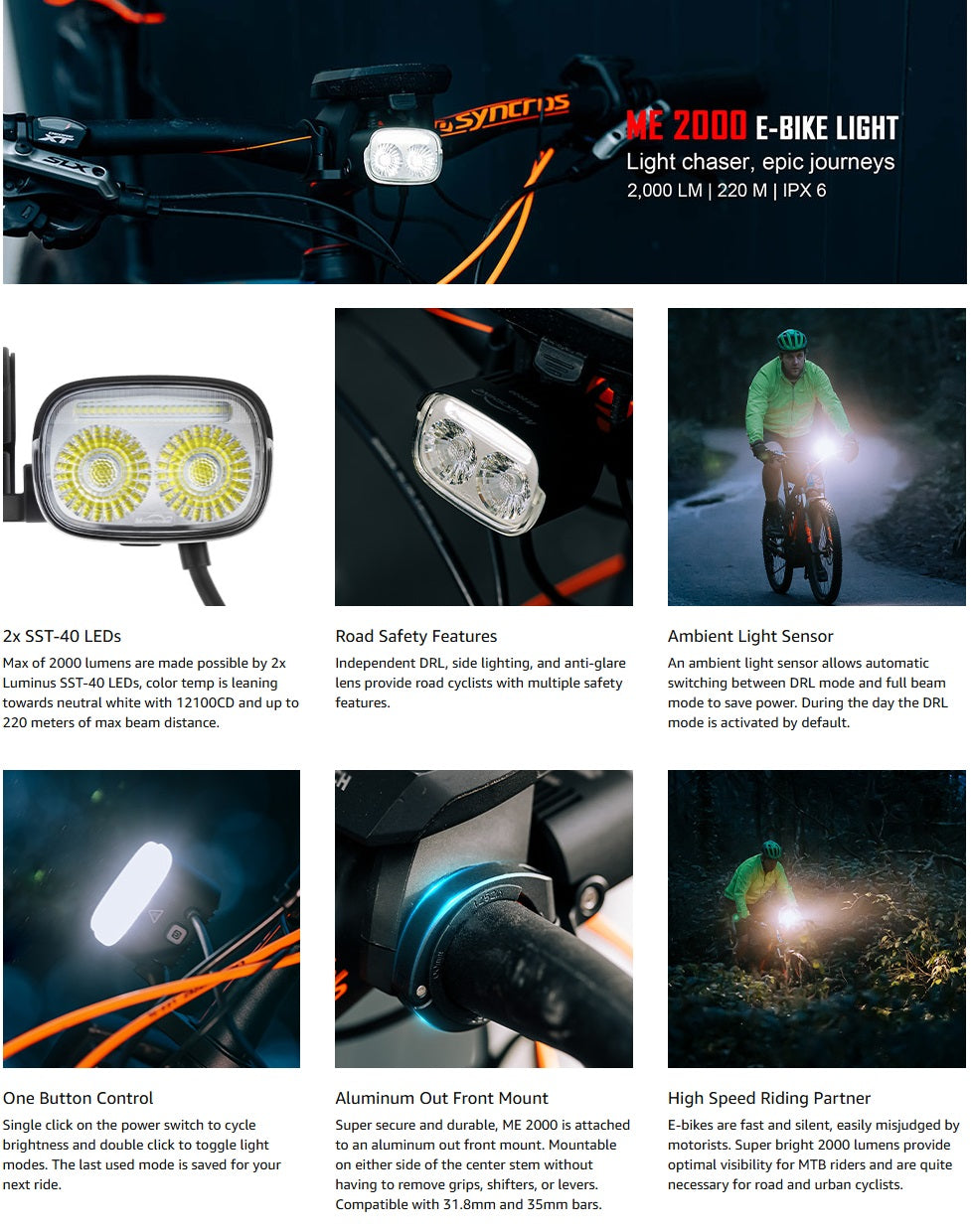 - ✅ 【Powerful E-Bike Light for Mountain, Road and Urban Cyclists】 Wide spreading optimized beam pattern for mountain biking, at the same time, DRL, side lighting and anti-glare designs to improve road safety. The ME 2000 provides top notch performance on and off the trails.