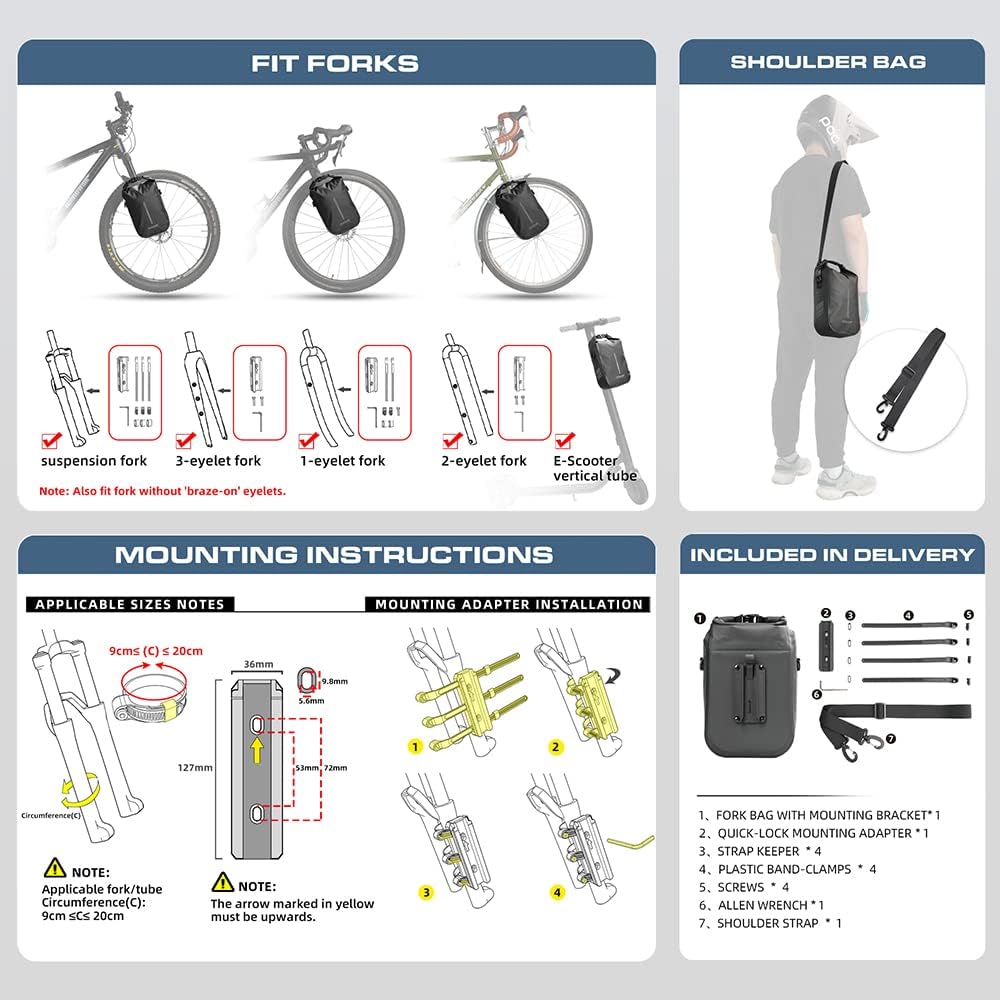 - EASY TO INSTALL:This fork bag use the Quick-Lock System(mounting bracket and adapter) to attach the bag to the fork or tube. And with the quick release function you can simply move the release lever and pull the bag upwards allowing for quick disassembly and use.