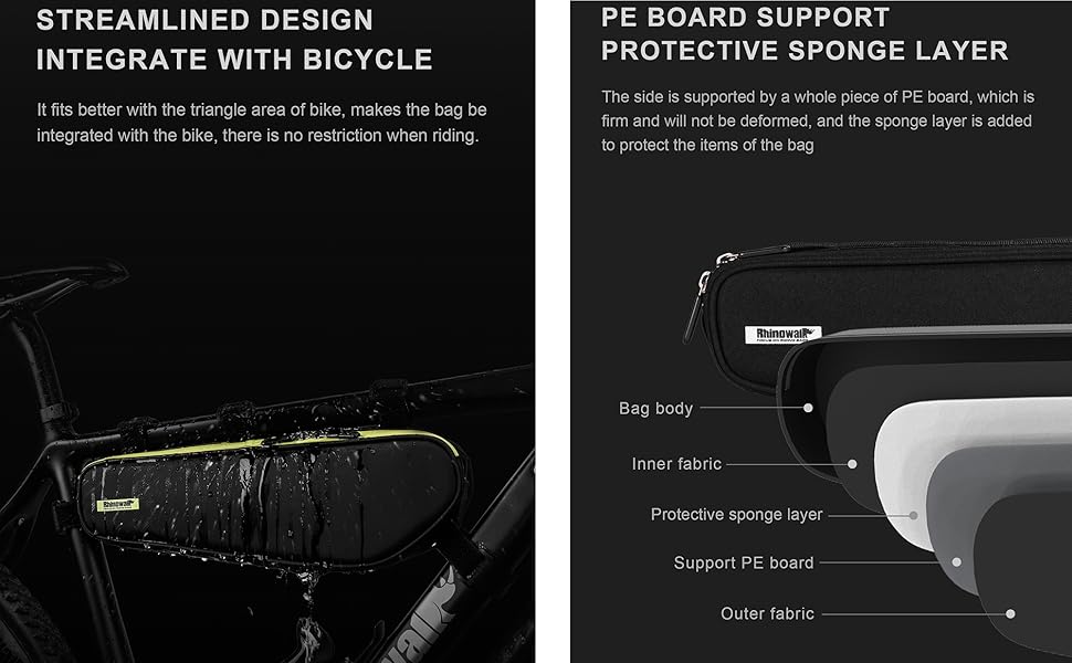 - 【Material of Bike Frame Bag】PVC netting cloth/ polyester. The side of the bike bag is supported by a whole piece PE board, which is firm and will not be deformed, and the sponge layer is added to protect the items in the bag.