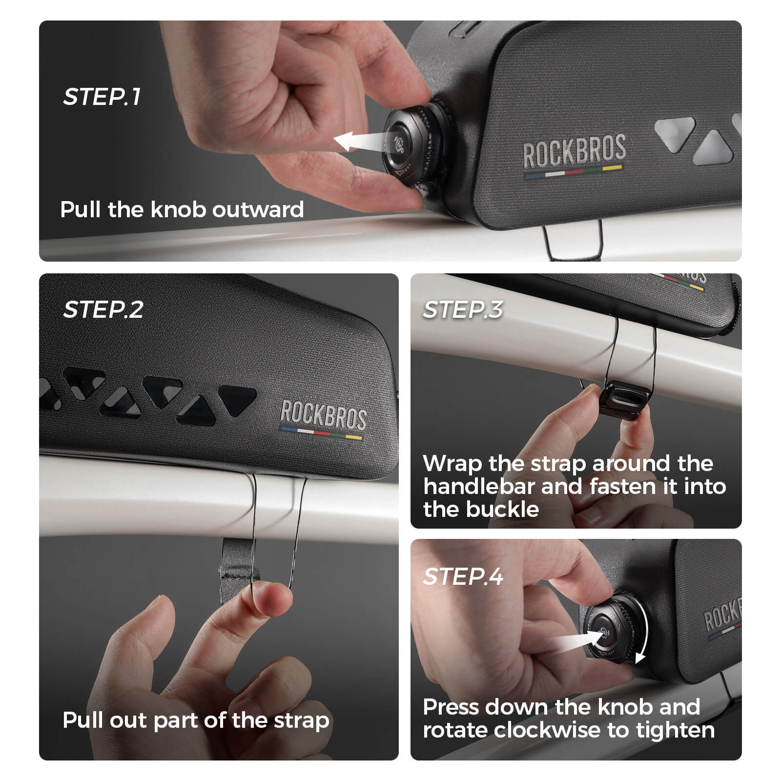 - Easy Installation: The ROCKBROS top tube bag features an innovative self-developed mounting system with a durable knob and high-strength binding rope. Simply pull, wrap, and press to secure—fast, firm, and wobble-free.