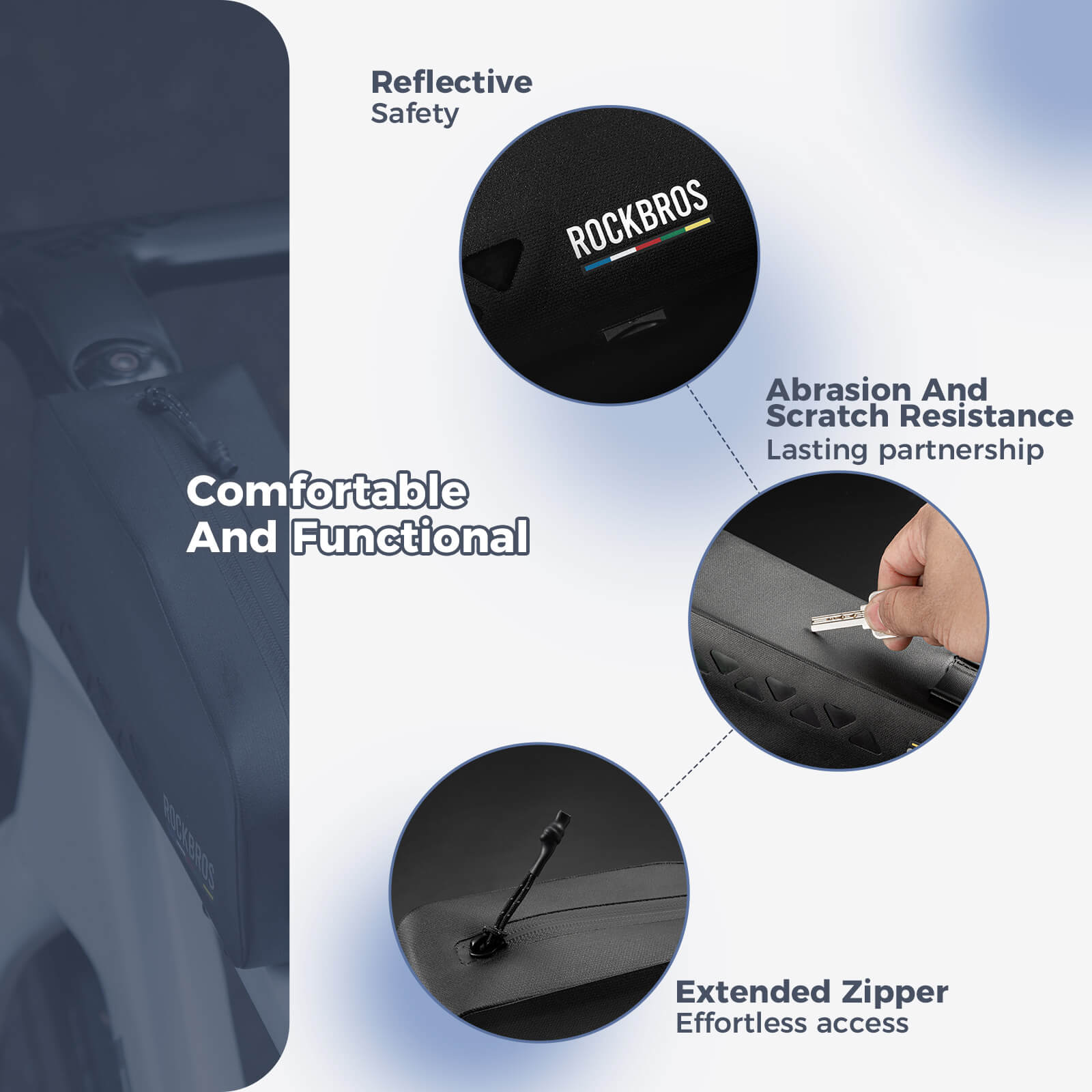 - Night Riding Safety: A reflective logo strip improves visibility in low light, while a transparent side window helps you quickly identify and access items.