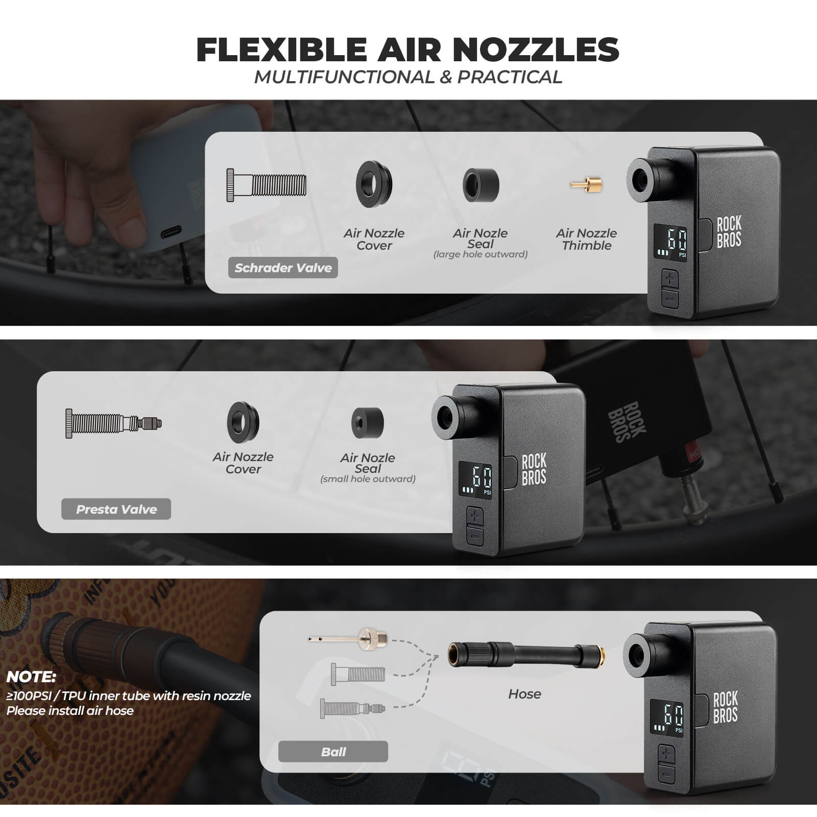 Red: Below 50% charge - Presta & Schrader Valve Compatibility : This mini electric pump is designed to easily switch between Presta and Schrader valves, making it suitable for both road and mountain bikes. It also includes a silicone protector, which helps protect the aluminum alloy body from scratches. Even accidental drops won't damage the pump.