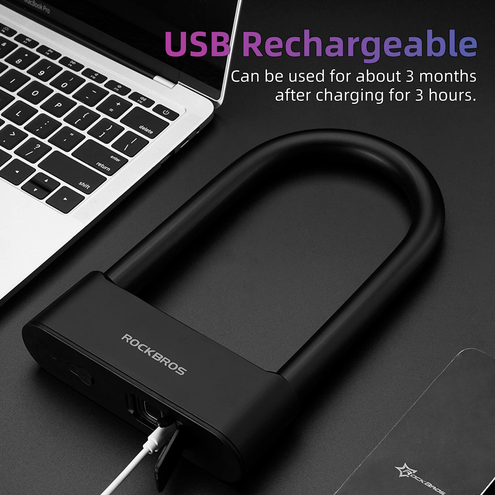 Equipped with a rechargeable USB battery, offering up to 3 months of use after 3 hours of charging. -