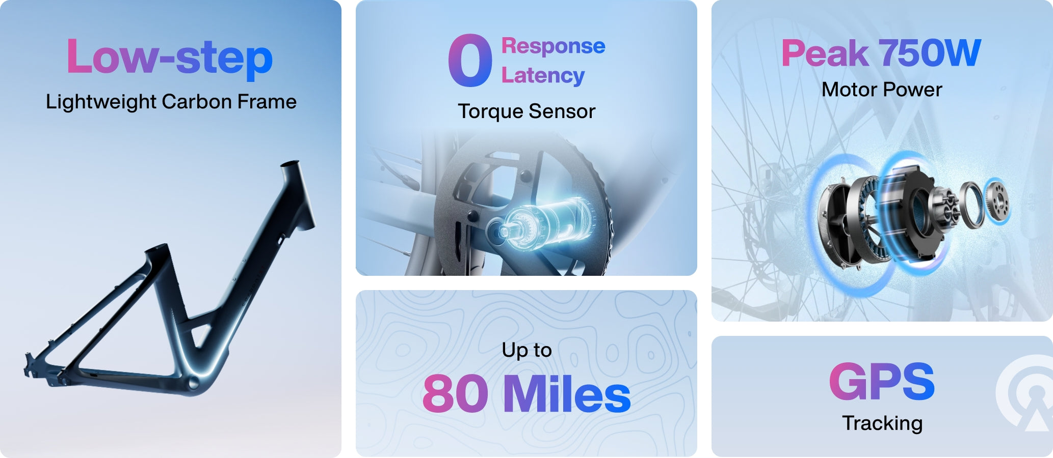 4 levels of pedal assist paired with a torque sensor, accelerometer, and gyroscope for intuitive, natural-feeling ride support