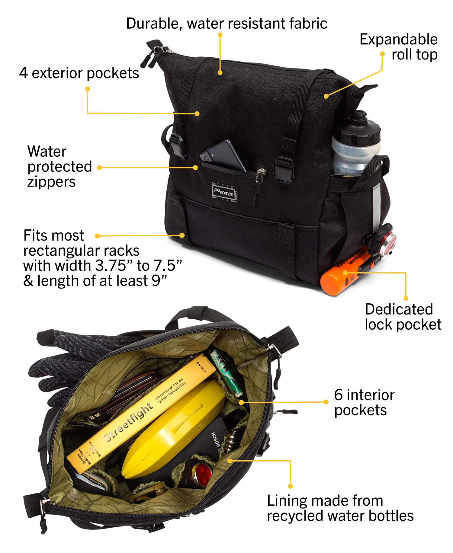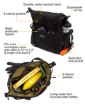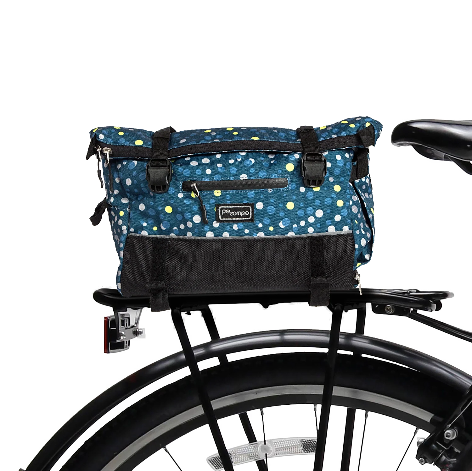 Don’t limit your adventures with limited space! The Vernon Bike Trunk Bag was crafted to comfortably store snacks, clothes, and whatever else you need for a perfect, carefree ride. With waterproof fabric, recycled Reboyarn® lining, and four strong hook and loop attachments sized for most bike racks this bike trunk bag will sustain you wherever you go.